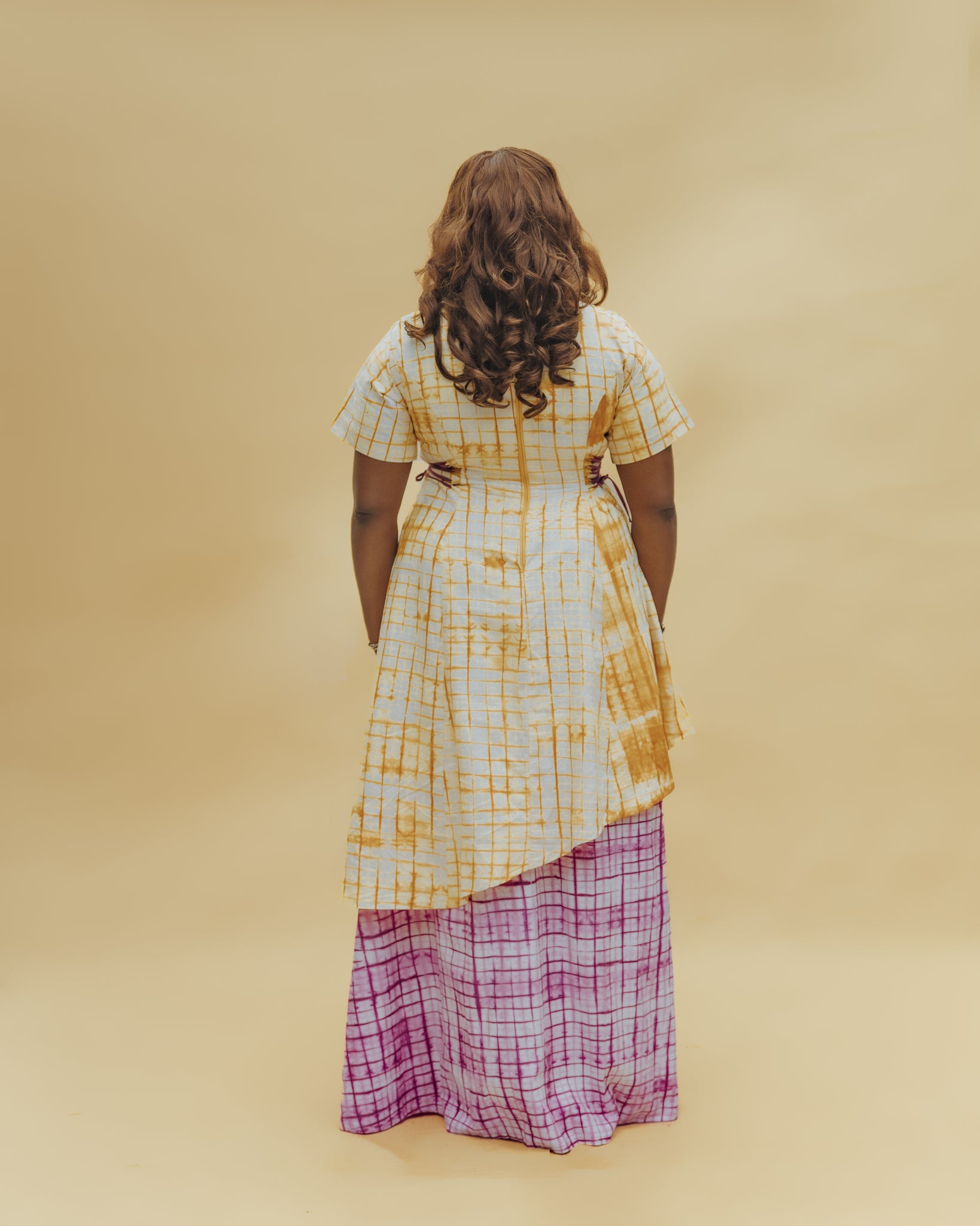 Step out in bold elegance with our Adire layered Maxi Dress. Featuring a striking blend of mustard yellow and purple hand dyed patterns, this dress is a true work of art. The structured bodice flows into a graceful layered skirt, giving you a flattering fit that's both sophisticated and comfortable.