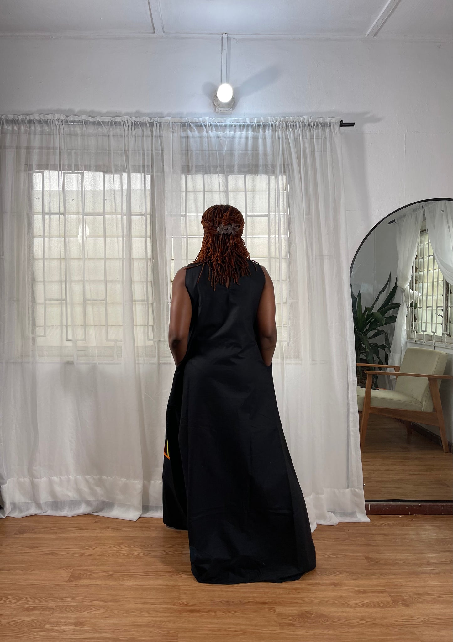 It is a black sleeveless maxi dress