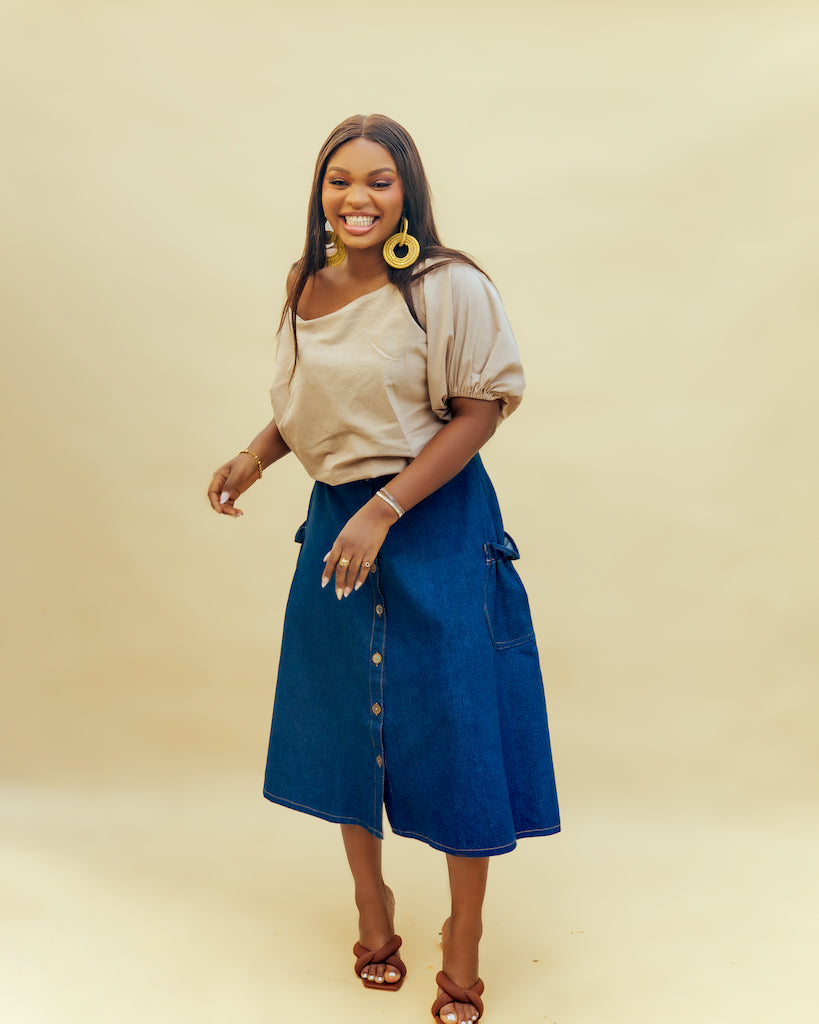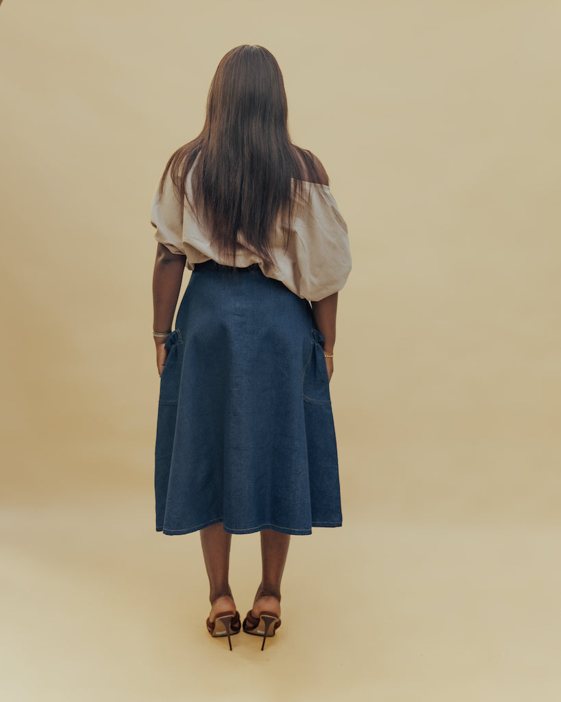 Our denim midi skirt is a timeless wardrobe staple designed for style and comfort. Made from high quality denim, it features a flattering A-line silhouette that skims the body beautifully. The button-down front adds a touch of vintage charm, while the midi length makes it versatile enough for both casual days and dressy evenings.